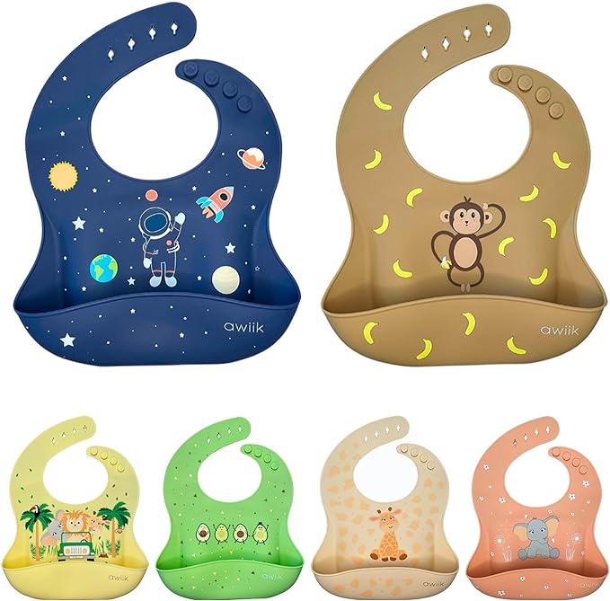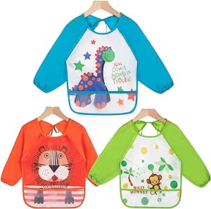 En amazon y/o cualquier tienda de bebés tendréis estos baberos de plástico lavables super chulos y estos otros que recogen la comida: